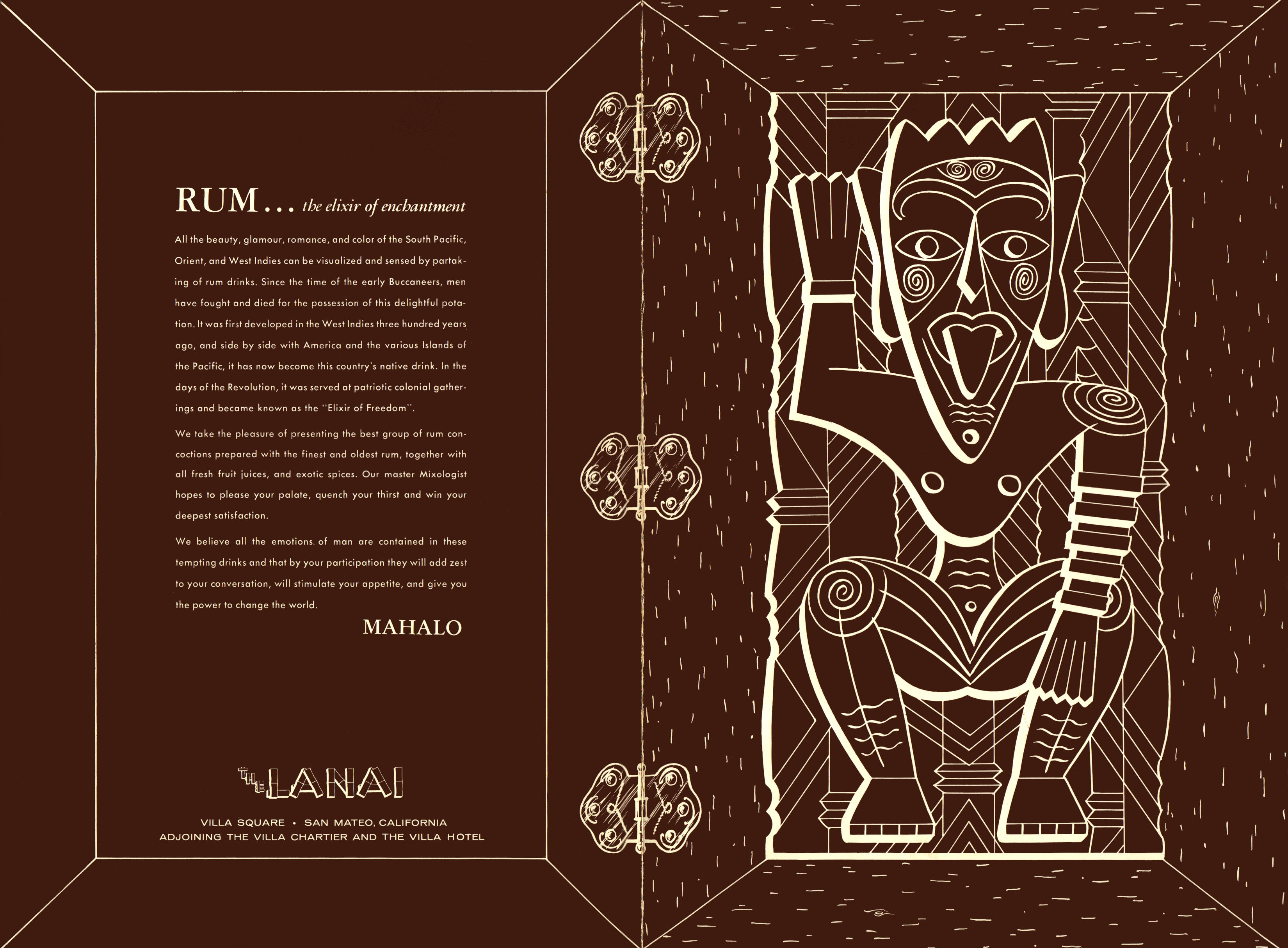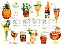 The LANAI drink menu, front and back cover This shows the unfolded front and back covers of the drink menu. Fullsize JPG (22" x 16", 823k) |