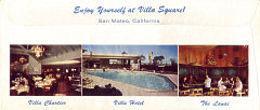 Villa Plaza envelope Envelope shows three of the main attractions in San Mateo's Villa Plaza - the Villa Chartier restaurant, the Villa Hotel itself (with swimming pool shown), and the Lanai restaurant. |