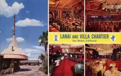 THE VILLA CHARTIER and LANAI RESTAURANTS postcard Here's the text on the back... 4060 & 4070 El Camino Real San Mateo, California The Villa Chartier Restaurant features Continental Cuisine, specializing in Live Maine Lobsters, Fresh Eastern Oysters and Clams and famous for Prime Rib since 1925. The Lanai Restaurant features Cantonese, Hawaiian, and Far East Cuisine, Specializing in Exotic foods and drinks. Two of America's truly fine restaurants located 30 minutes from San Francisco, just 3 blocks south of Bay Meadows Race Track. |